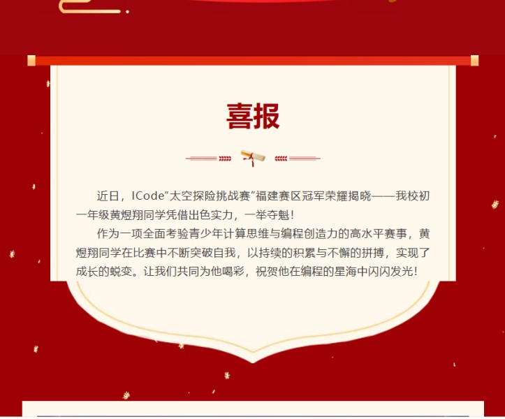 |又夺冠了|初一“后浪”锁定C位!我校黄煜翔同学斩获ICode省赛冠军