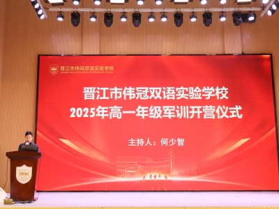 2025年10月30日,晋江市伟冠双语实验学校2025级高一军训开营仪式由高中部德育主任何少智主持召开。