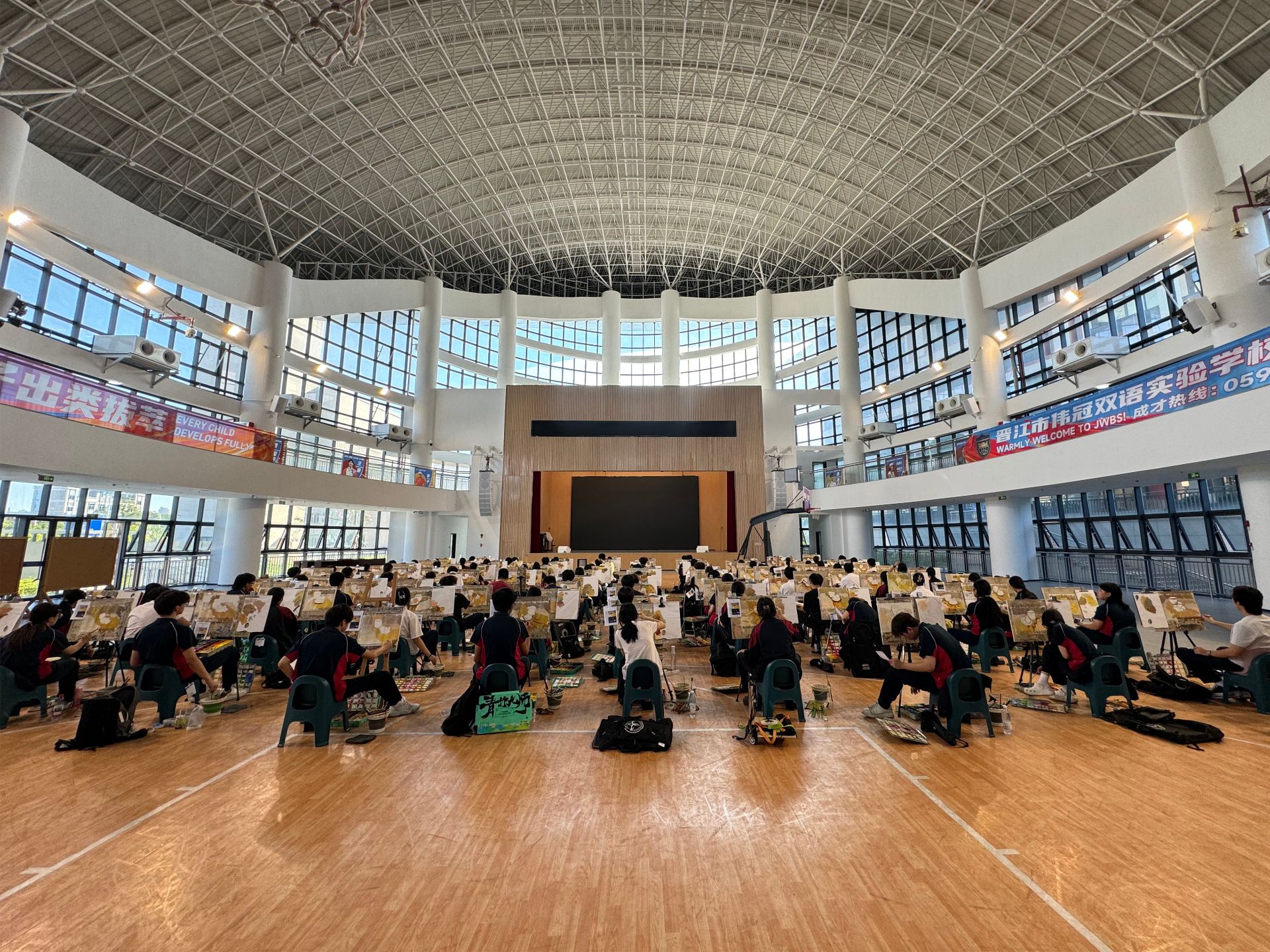 晨光洒入晋江市伟冠双语实验学校艺体馆,数百画架已在篮球场整齐列阵。第三次美术模拟联考,悄然将青春的“硝烟”铺满场馆。这不仅是一场考试,更是我校美术自主培养体系的一次集中检阅。