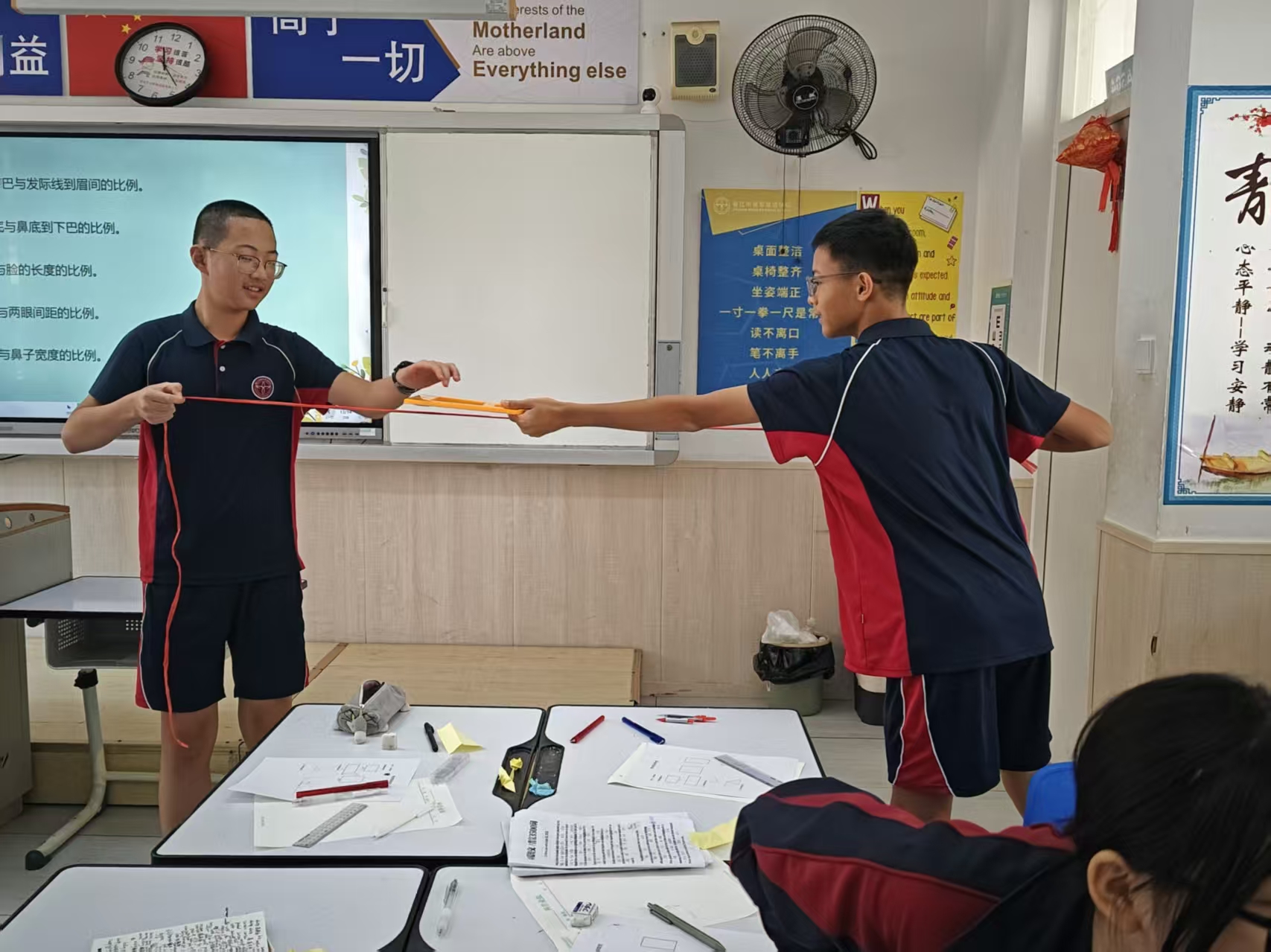 在“学科建设深化、数智赋能教学”的理念指引下,初中数学组将抽象的“黄金分割”知识转化为生动的实践课堂——以“黄金身高与面部比例”为主题,让学生在动手测量中触摸数学与美学的联结。 课堂上,学生们以小组为单位分工协作:有人手持卷尺测量身高,有人用软尺比对眉间、鼻翼的比例,有人记录数据并计算比值。从“发际线…